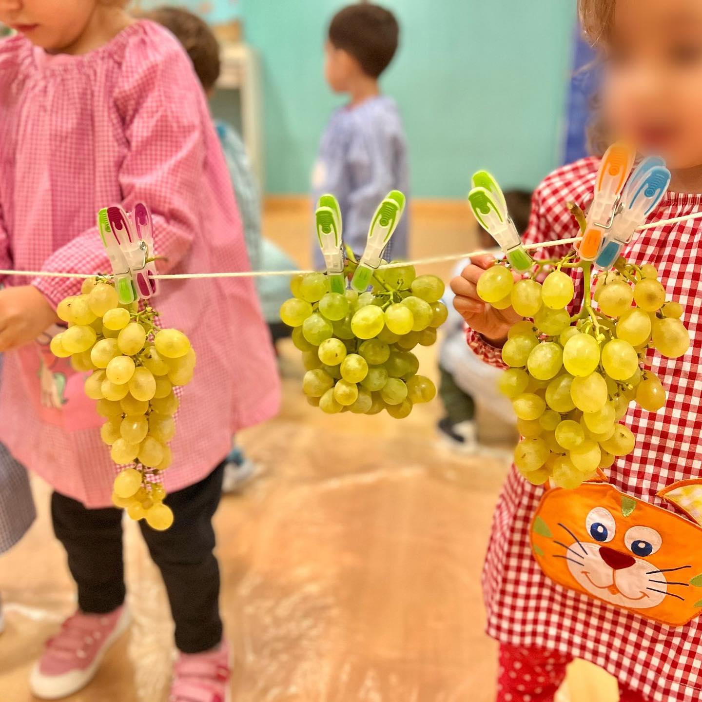 Después de que las profes preparen nuestro viñedo, l@s peques recogen las uvas una a una, van llenando los barreños y se preparan para el gran momento… ¡LAS PISAMOS!.
